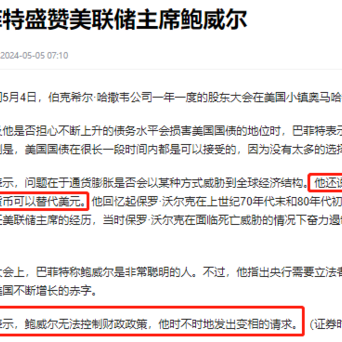 他回忆起保罗沃尔克在上世纪70年代末和80年代初的通胀压力下担任美联储主席的经历,当时沃尔克在面临死亡威胁的情况下奋力遏制了通胀。巴菲特称美联储主席鲍威尔是一个“非常明智的人”,但他指出,鲍威尔无法控制财政政策,而这正是问题的根源。